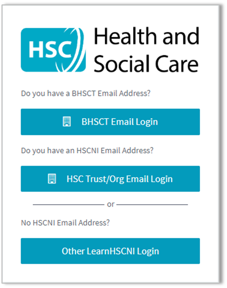 If you use a BHSCT Email address, or a HSC Trust/Org Email address to login to LearnHSCNI, you cannot use the LearnHSCNI system to reset your password. You will need to use your locally available services to reset these passwords. If you use a password managed by the LearnHSCNI system (you use the Other LearnHSCNI Login option to login), and, you have an email address associated with your LearnHSCNI account, you can use the process outlined below to reset your forgotten password. If you do not have an email address associated with your LearnHSCNI account, you will need to contact your local support team for assistance.